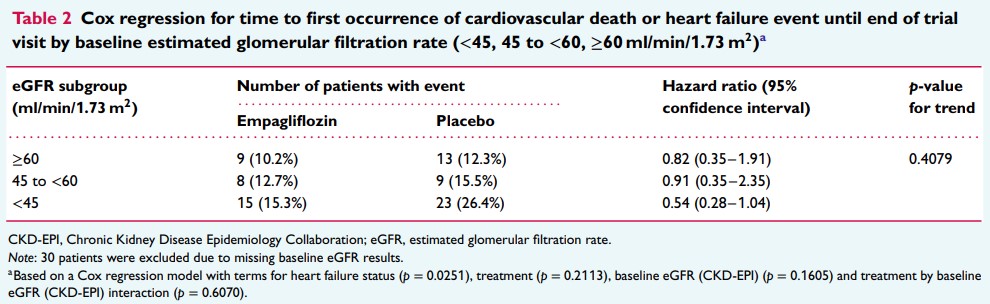 同様に、ベースラインのeGFRは、「心血管死または心不全イベント」の複合副次アウトカムに対するエンパグリフロジンの効果に影響を与えなかった。