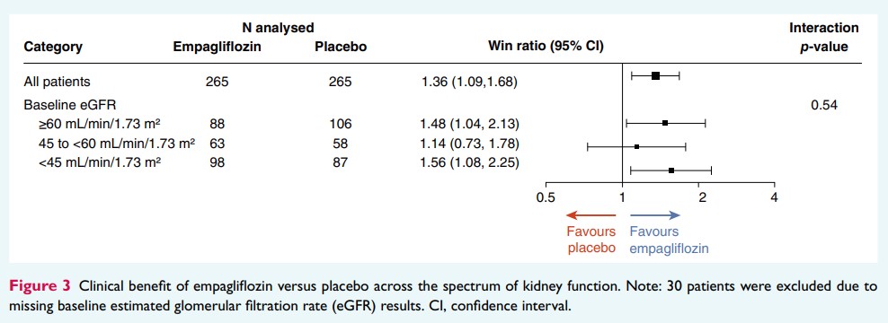 eGFR<45、45≦eGFR<60、eGFR≧60ml/min/1.73m2におけるエンパグリフロジンを投与された患者の勝率は、それぞれ、1.56(1.08-2.25)、1.14(0.73-1.78)、1.48(1.04-2.13)であり、eGFRのサブグループ間で交互作用は認められなかった(交互p値=0.5400)(図3)。