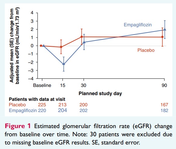 エンパグリフロジンは、初期にeGFRの低下(イニシャルディップ)を引き起こし、プラセボと比較して15日目に2ml/min/1.73mの平均差に達した(p=0.0822)。