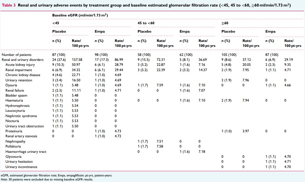 腎障害全体の発生率はプラセボ群の17.0%に対し、エンパグリフロジン群で11.2%であった(p=0.0528)。