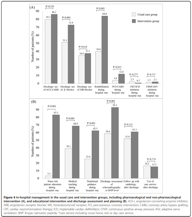 また、「入院中における看護師による患者教育、薬剤師による薬学教育、栄養士による栄養士指導の教育的介入」と「心エコー検査またはBNPレベルの退院時評価」も、通常治療群と比較して、介入群の方が多かった(全p<0.01、図4B)。