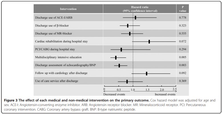 Cox比例ハザード分析により、学際的集中教育(3種類の教育)が、全ての医学的および非医学的介入の中で主要転帰のリスクを軽減するための最も効果的な介入であることが示された[HR 0.387(95%CI 0.200-0.738); p<0.001(図3)]。