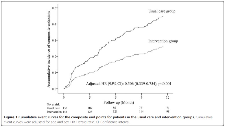 Cox比例ハザード分析では、介入群の患者は、通常治療群の患者と比較して、複合エンドポイントのリスクが約50%減少したことが示された[HR0.506(95%CI 0.339-0.754); p<0.001(図1)]。