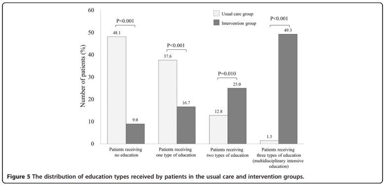 さらに、介入群の患者は、通常治療群の患者と比較して、複数 (2 つまたは3 つ)の教育を受けることが多かった (全p<0.05、図5)。