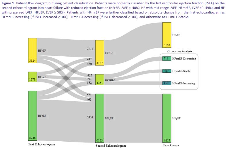 心エコー検査によるLVEFの軌跡でHFmrEF患者を分類することは、臨床医が意味のある情報を得て、心不全患者の管理に役立つことが示唆された。