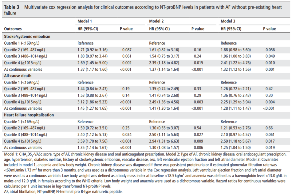 交絡因子を調整した多変量Cox回帰分析による、心不全のない心房細動患者のNT-proBNPレベルQ1に対するQ4の各臨床転帰(脳卒中/全身性塞栓症、全死亡、心不全入院)のハザード比は、それぞれ、HR 2.69(95%CI 1.45-5.00)、HR 3.12(95%CI 1.86-5.23)、HR 3.59(95%CI 1.70-7.56)であった。