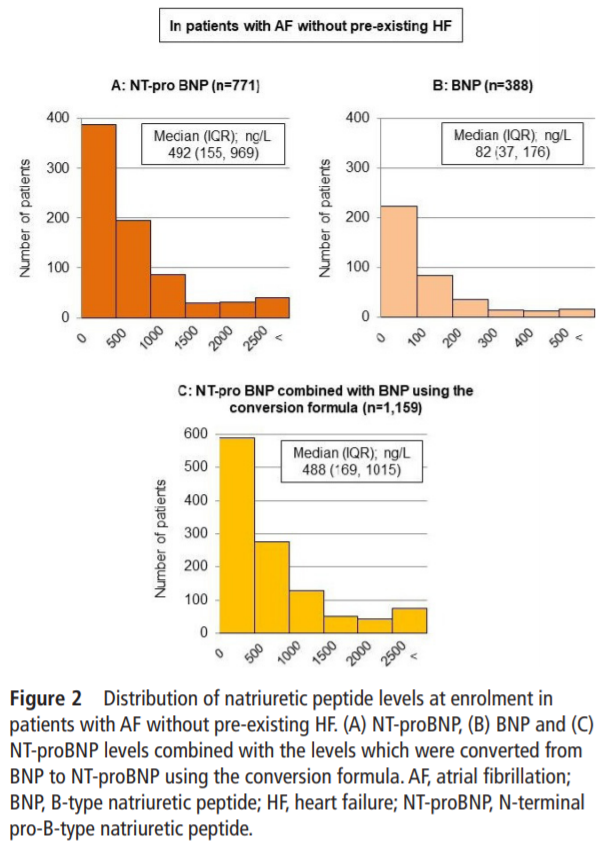 ナトリウム利尿ペプチドデータがあるHFのない心房細動患者1,159例のB型ナトリウム利尿ペプチド(BNP、n=388)のデータ、N末端プロB型ナトリウム利尿ペプチド(NT-proBNP、n=771)を使用して、HF(定義:HF入院の既往、NYHA≧2、LVEF<40%)のないAFの患者を調査した。