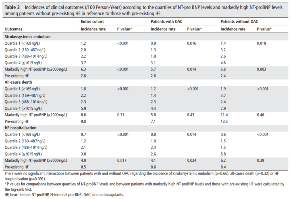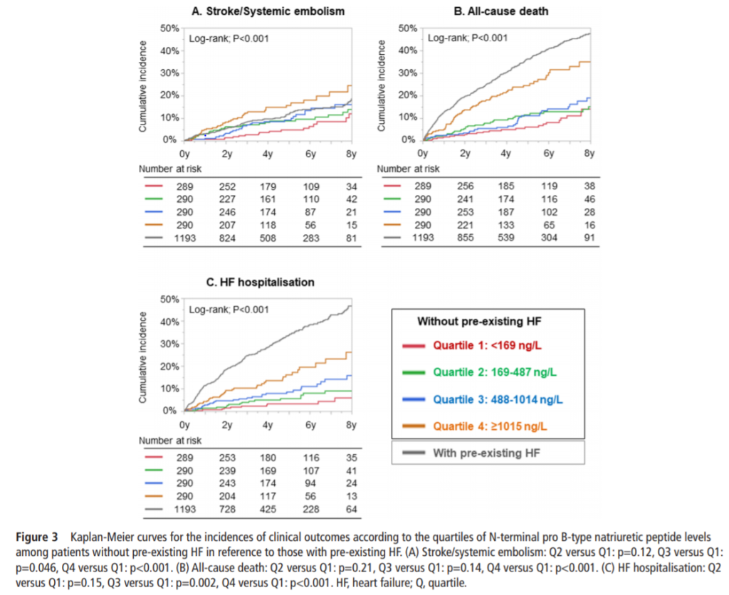 NT-proBNPレベルは、心不全を伴わない心房患者の重要な予後(脳卒中/全身性塞栓症、全死亡、心不全による入院)マーカーであり、心房細動患者のNT-proBNPを計測することの臨床的価値が示唆された。