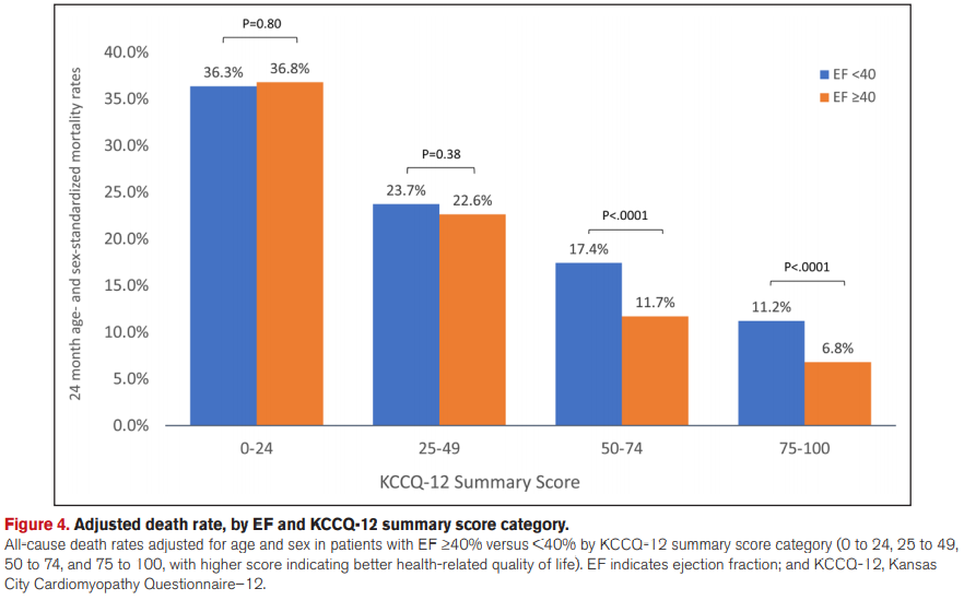 左室駆出率による、各KCCQ-12合計スコアは、「LVEF≧40%:54.6±0.3、LVEF<40%:52.8±0.2」となった(p<0.0001)。