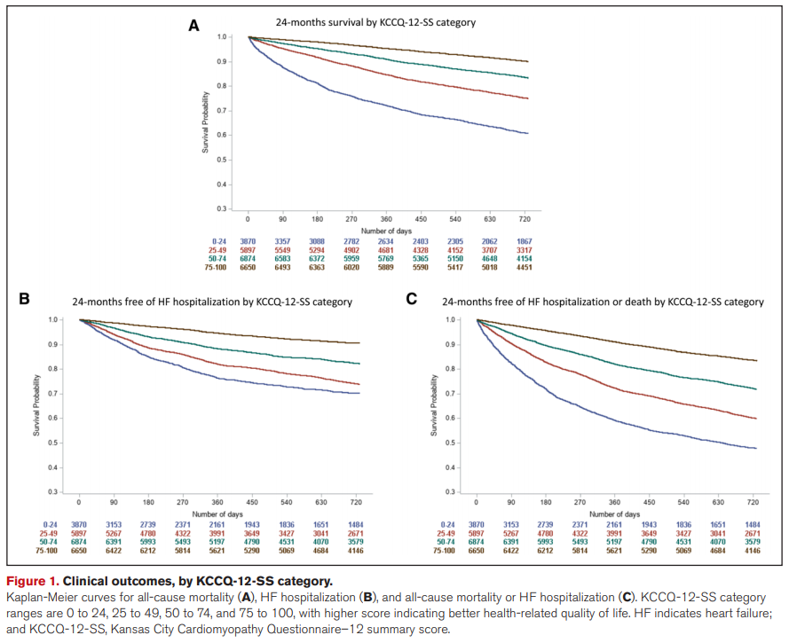 15の変数を調整した多変量Cox回帰分析を使用して、追跡期間(中央値1.6年)におけるKCCQ-12合計スコアと「全ての原因による死亡(全死亡)、心不全による入院、全死亡または心不全による入院」の関連を評価した。