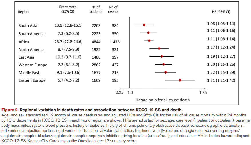 KCCQ-12合計スコアは、地域間で異なっていた(北米:58.2±0.5、西ヨーロッパ:62.5±0.4、東ヨーロッパ:51.3±0.6、東アジア:54.9±0.6、南アジア:54.9±0.6、アフリカ:39.5±0.3、南アメリカ:56.2±0.5、中東:61.6±0.6)。