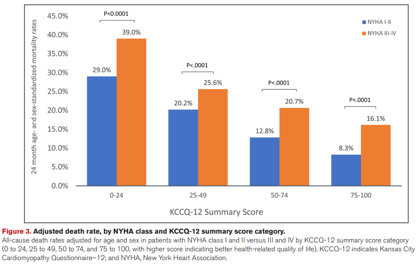 心不全重症度による、各KCCQ-12合計スコアは、「NYHAⅠ度:77.9±0.5、Ⅱ度:61.1±0.2、Ⅲ度:41.5±0.3、Ⅳ度:29.4±0.5」となった(p<0.0001)。