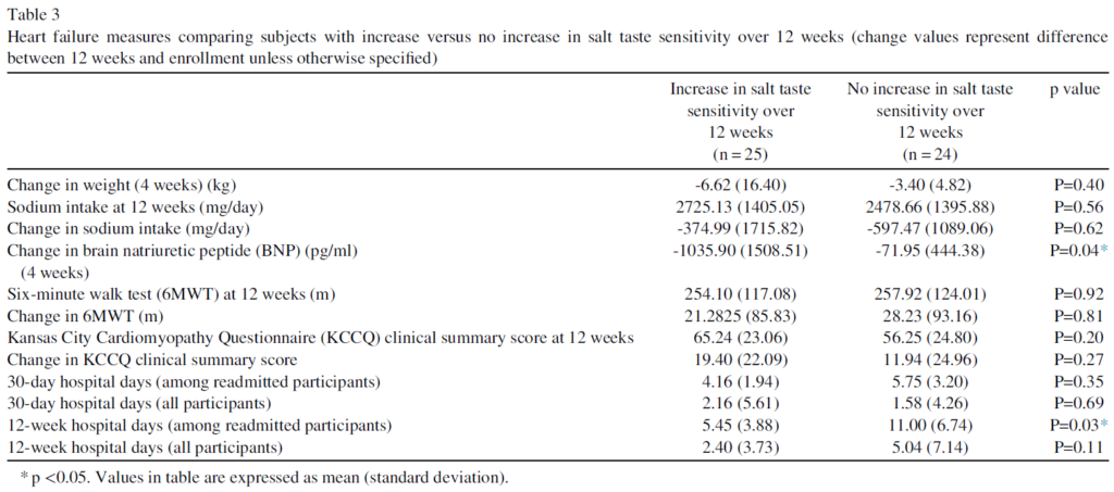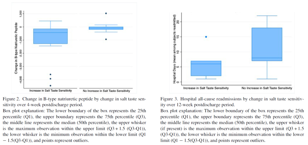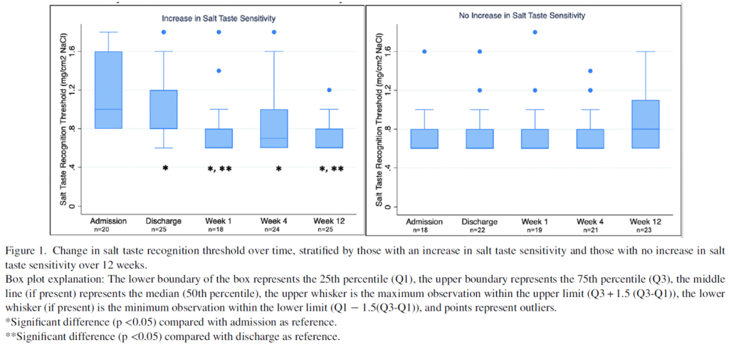 塩味感受性テストは、心不全の「入院時、退院時、退院後1、4、12週時」の食事後または喫煙後の少なくとも1時間後に実施し、退院後12週間(無作為割り付け4週間、追跡8週間)まで追跡した。