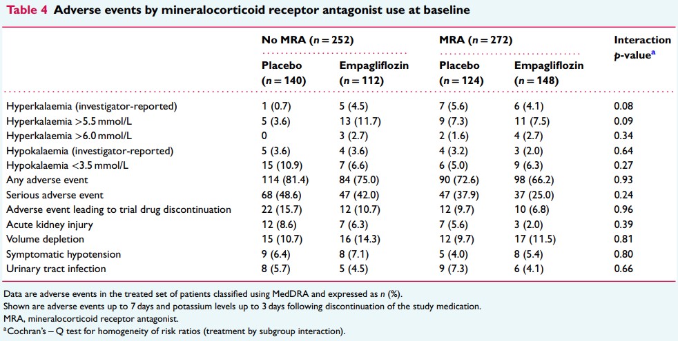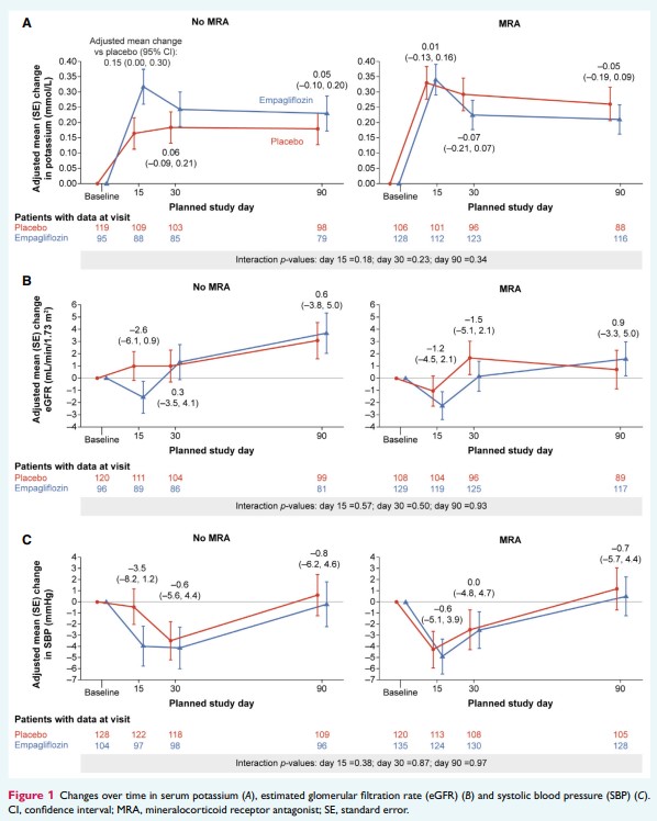 ベースライン以後の血清カリウム、eGFR、血圧、有害事象は、ベースラインのMRA使用の有無で、エンパグリフロジンとプラセボの間に大きな差は認められなかった。