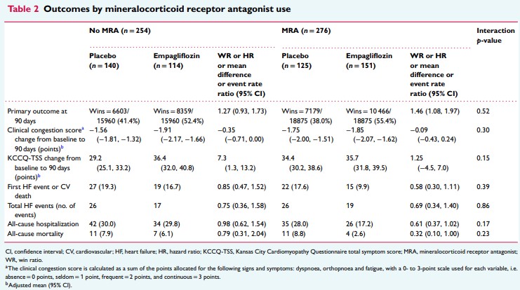 心血管死またはHF入院、HF入院の総数、全死亡の複合転帰は、ベースラインのMRA使用率にかかわらず、エンパグリフロジンのほうがプラセボよりも発生頻度が低く、健康状態(KCCQスコア)および臨床的うっ血スコアは、ベースラインのMRA使用率にかかわらず、エンパグリフロジンのほうがプラセボよりも改善した(全交互p値>0.1)。