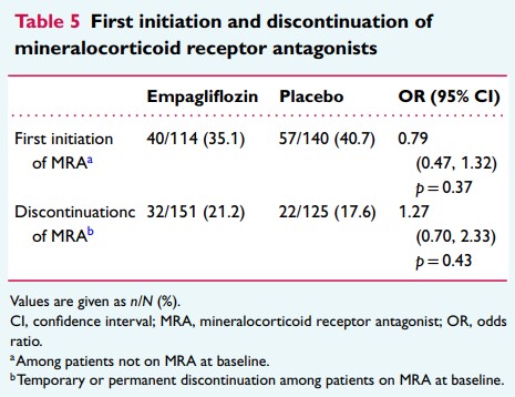 ベースライン時、エンパグリフロジン投与群ではより多くの患者がMRAを受けていた[エンパグリフロジン群 n/N=151/265(57.0%)、プラセボ群 n/N=125/265(47.2%)、p= 0.024](表5)。