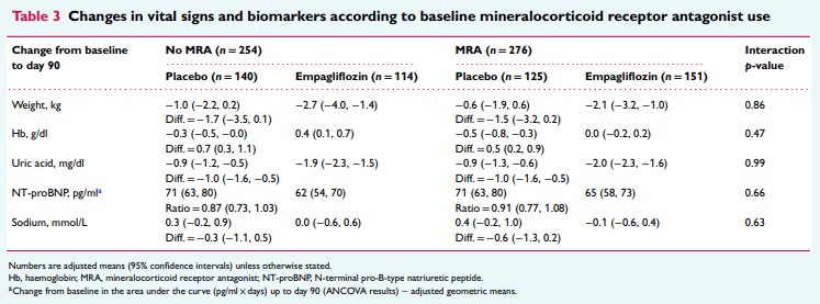 体重、ヘモグロビン、尿酸、NT-proBNP、ナトリウムの変化は、ベースラインのMRA使用量に関係なく同様であった(全交互p値>0.1)(表3)。