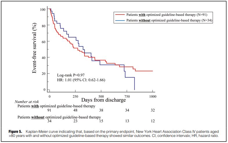 一方で、80歳以上でNYHA Ⅳ度のガイドライン推奨治療(GBT)治療を受けた患者は、受けなかった患者よりも転帰が良好な傾向があったが、その差は統計的に有意ではなかった[HR 1.01(95%CI 0.62-1.66); p=0.97]。