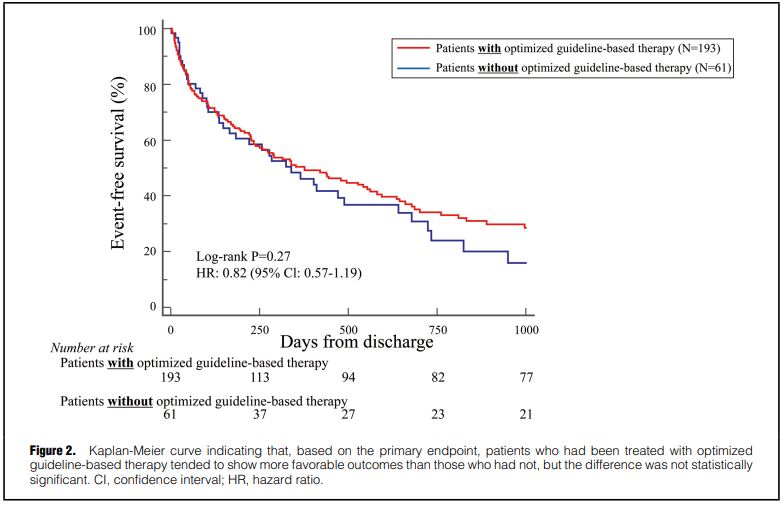 ガイドライン推奨治療(GBT)治療を受けた患者は、受けなかった患者よりも転帰が良好な傾向があったが、その差は統計的に有意ではなかった[HR 0.82(95%CI 0.57-1.19); p-0.27]。