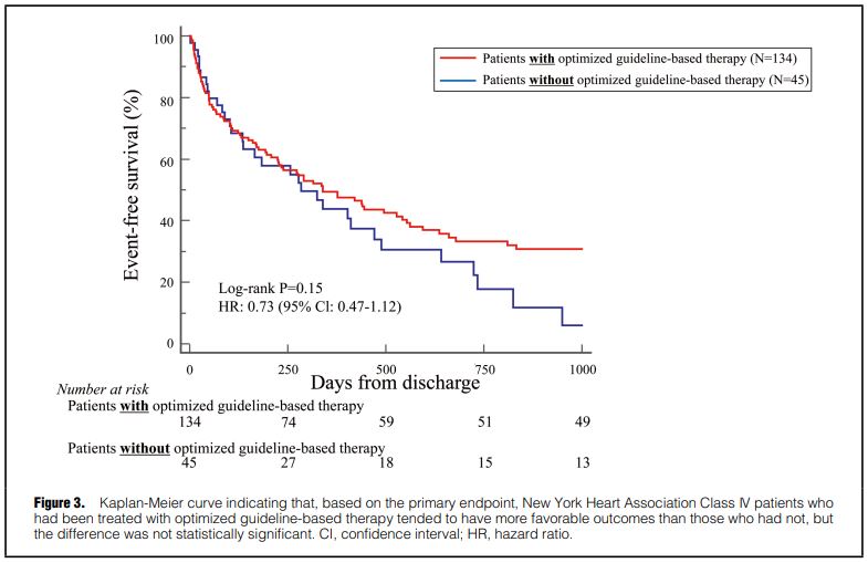 NYHA Ⅳ度のガイドライン推奨治療(GBT)治療を受けた患者は、受けなかった患者よりも転帰が良好な傾向があったが、その差は統計的に有意ではなかった[HR 0.73(95%CI 0.47-1.12); p=0.15]。