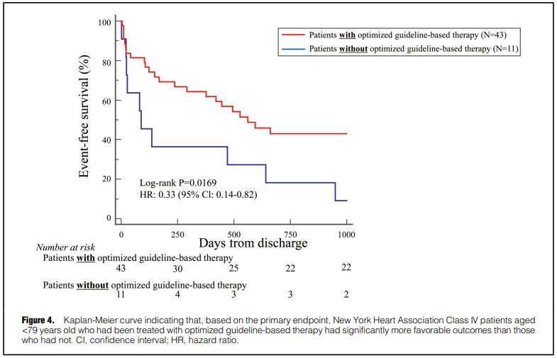 79歳未満でNYHA Ⅳ度のガイドライン推奨治療(GBT)治療を受けた患者は、受けなかった患者よりも転帰が有意に良好であった[HR 0.33(95%CI 0.14-0.82); p=0.02]。