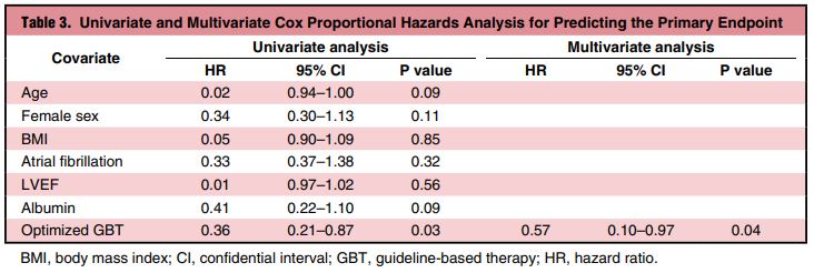多変量 Cox 回帰分析により、主要評価項目(全死亡または退院後の初発の心不全入院)の独立した要因を調査(年齢、女性、BMI、心房細動、左室駆出率、アルブミン、ガイドライン推奨治療)したところ、ガイドライン推奨治療(GBT)が唯一の要因であることが示された。