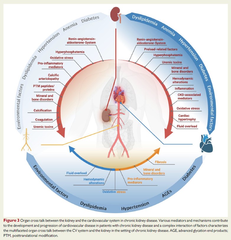 CKDにおけるCVDの発症は、高血圧、糖尿病、脂質異常症などの従来の危険因子と、炎症、酸化ストレス、レニン・アンジオテンシン・アルドステロン系の活性化、体液過負荷と血行動態の変化、ミネラル・骨疾患、尿毒症性毒素の蓄積およびCKD特異的な翻訳後修飾などのCKD関連因子によって引き起こされる複雑で多因子性のプロセスである。