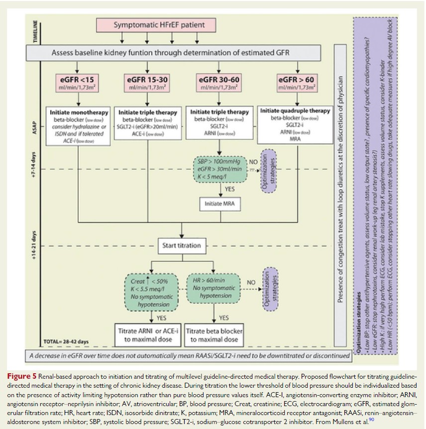 腎機能に基づく段階的なガイドライン指示薬物療法の開始と漸増のアプローチを示している: