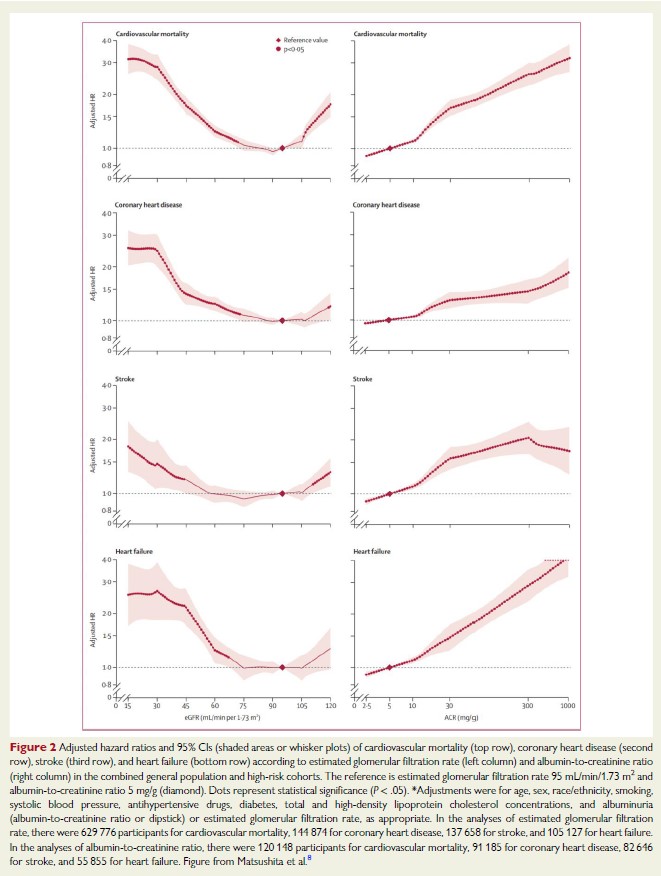- 低いeGFRと高いアルブミン尿は、年齢、血圧、糖尿病などの従来の危険因子とは独立して、すべてのCVDアウトカムと関連