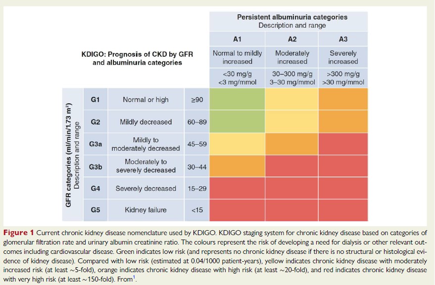 CKDステージは、糸球体濾過率(GFR)とアルブミン尿カテゴリーによって分類される(図1)。