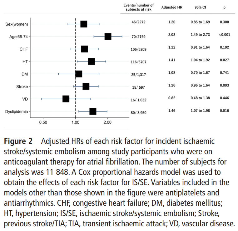 Cox比例ハザードモデルを使用して、IS/SEリスクに対する各危険因子(性別、年齢、うっ血性心不全、高血圧、糖尿病、脳卒中、血管疾患、脂質異常症)の影響(調整ハザード比)を検討した。