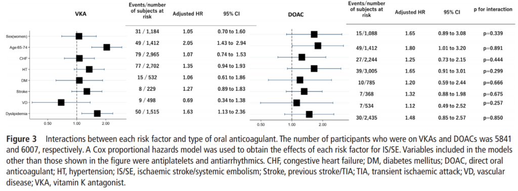 抗凝固療法を受けている患者をワルファリンとDOACに分けて、各危険因子のIS/SEリスクに対する調整ハザードを算出したが、交互作用が認められず、全体と同様の結果が示された。