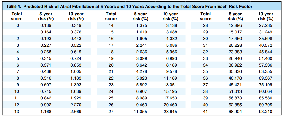 この予測モデルの合計スコアは、0~41点であり、10年後のAF発症リスクは「0点:0.319%、10点:1.639%、20点:8.189%、30点:35.698%、41点:93.210%」となり、漸増的な増加を示した。