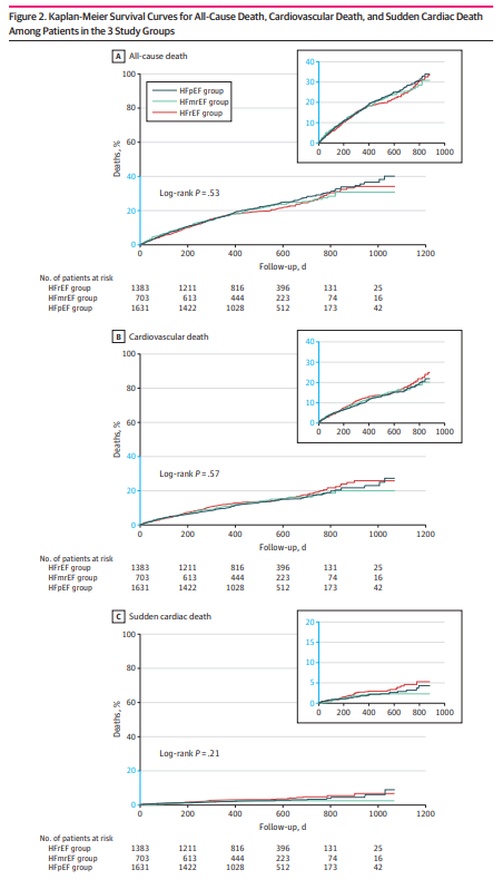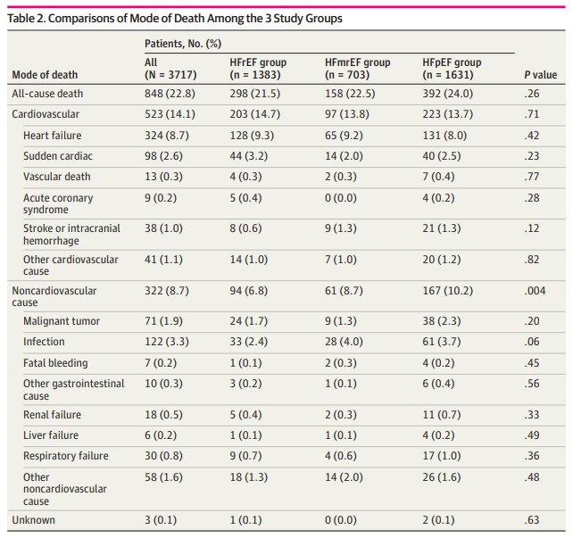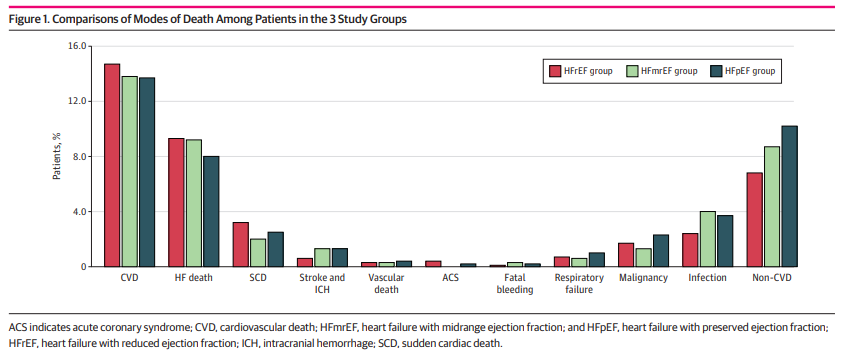 駆出率が低下した心不全(HFrEF)、駆出率が中等度の心不全(HFmrEF)、駆出率が維持された心不全(HFpEF)のサブタイプ間で、死亡率と死亡原因に関するデータは限られている。