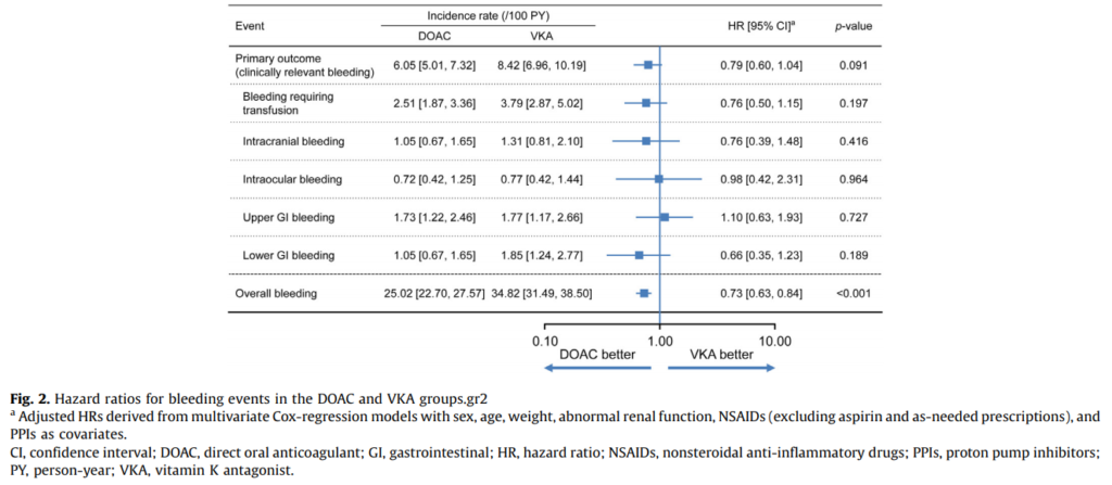NVAF(非弁膜症性心房細動)およびPCI(経皮的冠動脈インターベンション)施行したIHD(虚血性心疾患)患者は、VKA(ビタミンK拮抗薬)よりも、DOAC(直接経口抗凝固薬)で治療する方が、「臨床的に関連する出血」のリスクが低いことが示唆された。