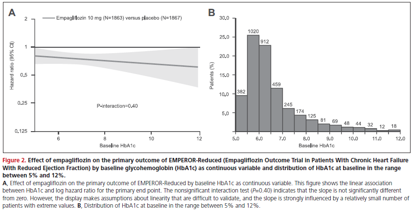 また、ベースラインのHbA1c(5%~12%)を連続変数として分析した場合、主要評価項目(初発の心血管死または心不全入院までの期間)に対するSGLT2阻害薬群の効果にも一貫性が示された(交互p=0.40)。