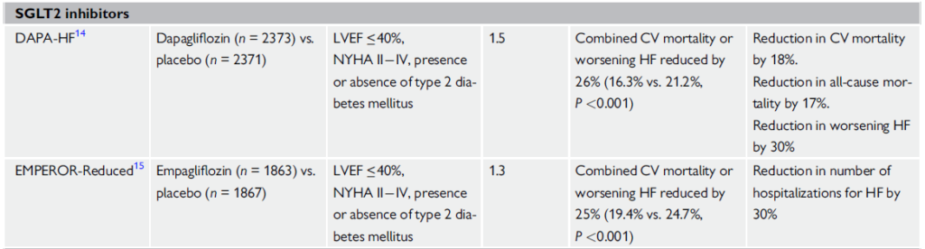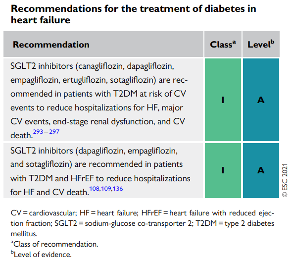 SGLT2阻害薬(ダパグリフロジン、エンパグリフロジン、ソタグリフロジン)は、「心不全入院と心血管死」を減らすために、HFrEF合併2型糖尿病患者に推奨される。