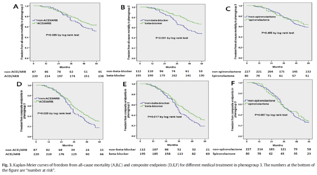 コホート全体におけるACE阻害薬/ARB、β遮断薬、スピロノラクトンの治療効果は、追跡期間の「全死亡」と「全死亡とHFによる入院の複合イベント」のリスク低下とは関連していなかった。