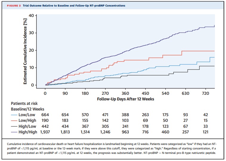 つぎに、無作為化後12週までに主要評価項目のイベントを発症しなかった被験者(3,730例の87%)を対象とし、ベースラインから12週目までに変化したNT-proBNPと「心血管死または心不全による入院」のリスクを評価した。