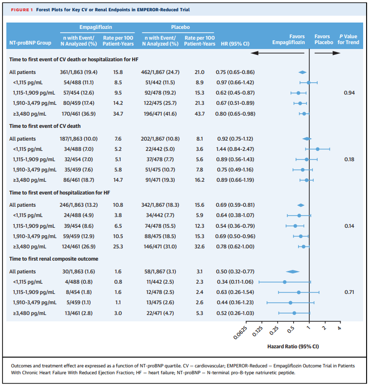 EMPEROR-Reduced試験では、SGLT2阻害薬(エンパグリフロジン)の治療は、ベースラインのNT-proBNPレベルに関わらず、HFrEF患者の心血管および腎エンドポイントのリスクを低下させることが示された。