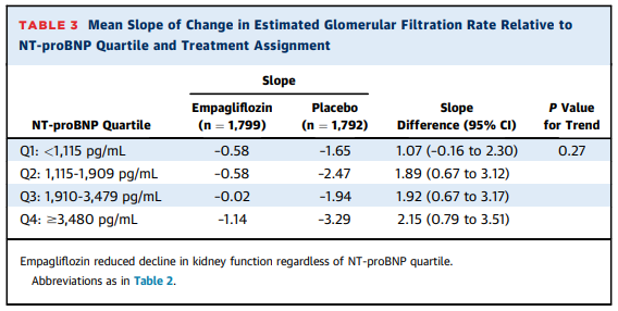 となり、SGLT2阻害薬による治療は、ベースラインのNT-proBNP値に関わらず、eGFRの低下を抑制していることが示された(交互p=0.27)。