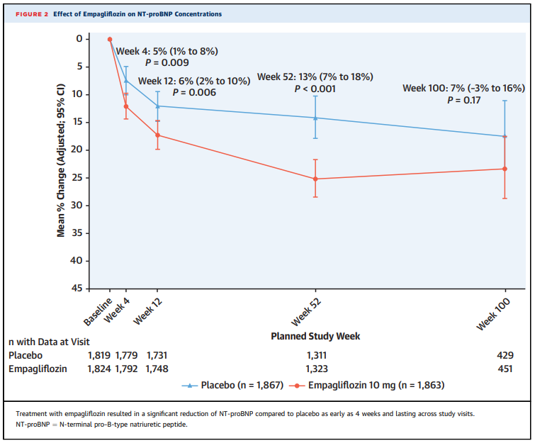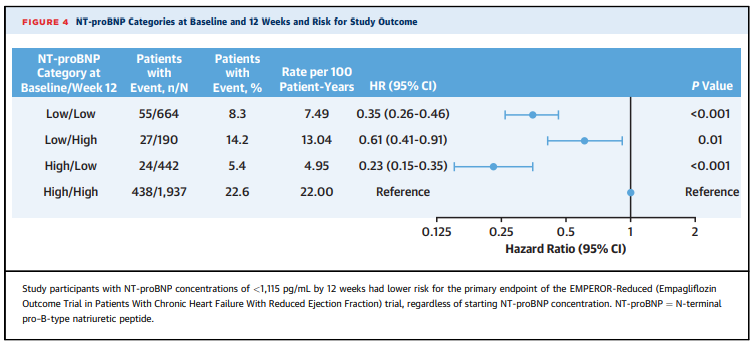 SGLT2阻害薬による治療は、NT-proBNPを低下させるだけでなく、無作為化12週目までのNT-proBNPの推移は、ベースラインのNT-proBNPよりも予後を予測することを示した。