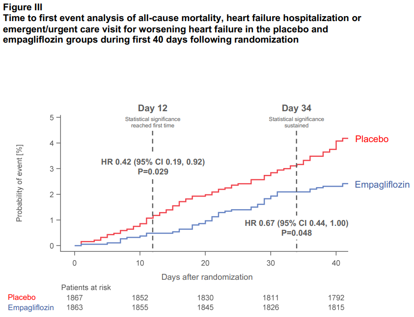 また、エンパグリフロジン治療による、「割り付け後40日間における初発の全ての原因による死亡(全死亡)、心不全による入院、または心不全悪化による緊急治療」イベントのリスク低下は、