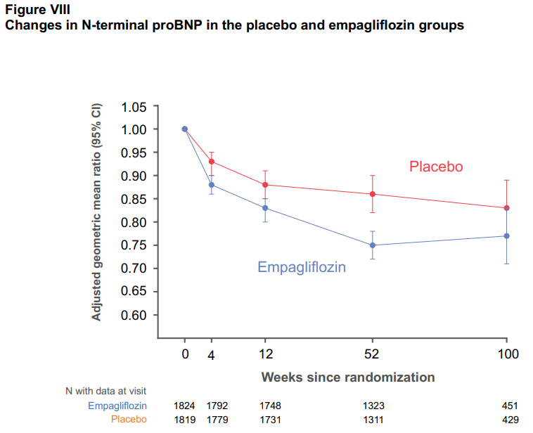 NT-proBNPは、プラセボと比較して、4週間後にわずかな減少し、その差は時間経過とともに増加を示した。