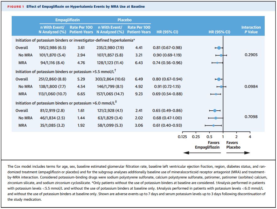 MRAで治療された被験者は、その未治療被験者と比較して、約2倍の高カリウム血症を発症したが、SGLT2阻害薬は、高カリウム血症のレベル(> 5.5 mmol/L、> 6.0 mmol/L)に関係なく、「高カリウム血症と高カリウム血症の治療」を減少する傾向が示された。