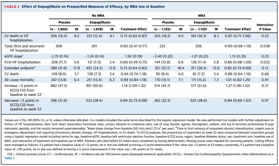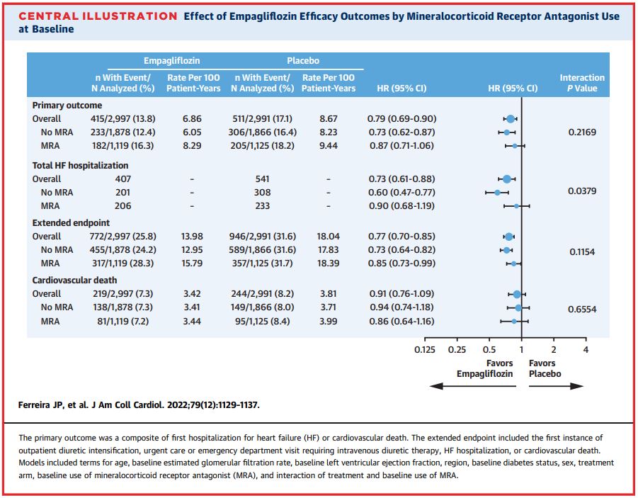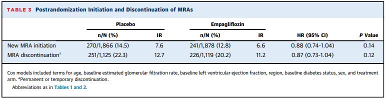 ベースラインにおけるMRA(鉱質コルチコイド受容体拮抗薬)治療の有無に関わらず、主要評価項目(心血管死または心不全による入院)に対する効果は、SGLT2阻害薬(エンパグリフロジン10㎎/日)で一貫していることが示された。