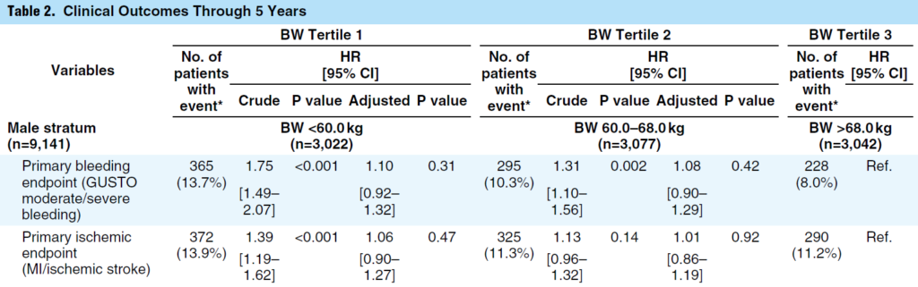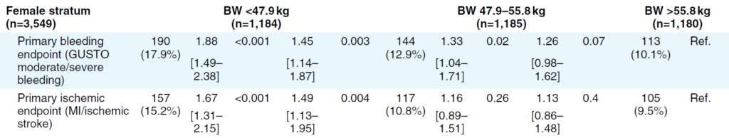 3分位数のTertile③(過体重)を基準とした、Tertile①(低体重)の出血および虚血イベントの有意なリスク増加は、女性のみに認められた。