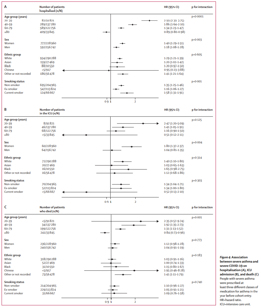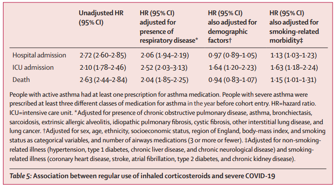別の事後分析では、研究開始の150日前に2剤以上のICSで治療されている重症COVID-19患者は、1剤以下のICSで治療されている患者と比較して、「入院[HR 1.13(95%CI 1.03-1.23)、ICU入院[HR 1.63(95%CI 1.18-2.24)、死亡[HR 1.15(95%CI 1.01-1.31)]のリスクは若干高かった。