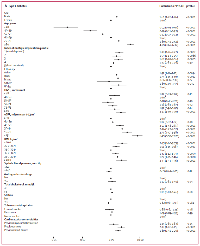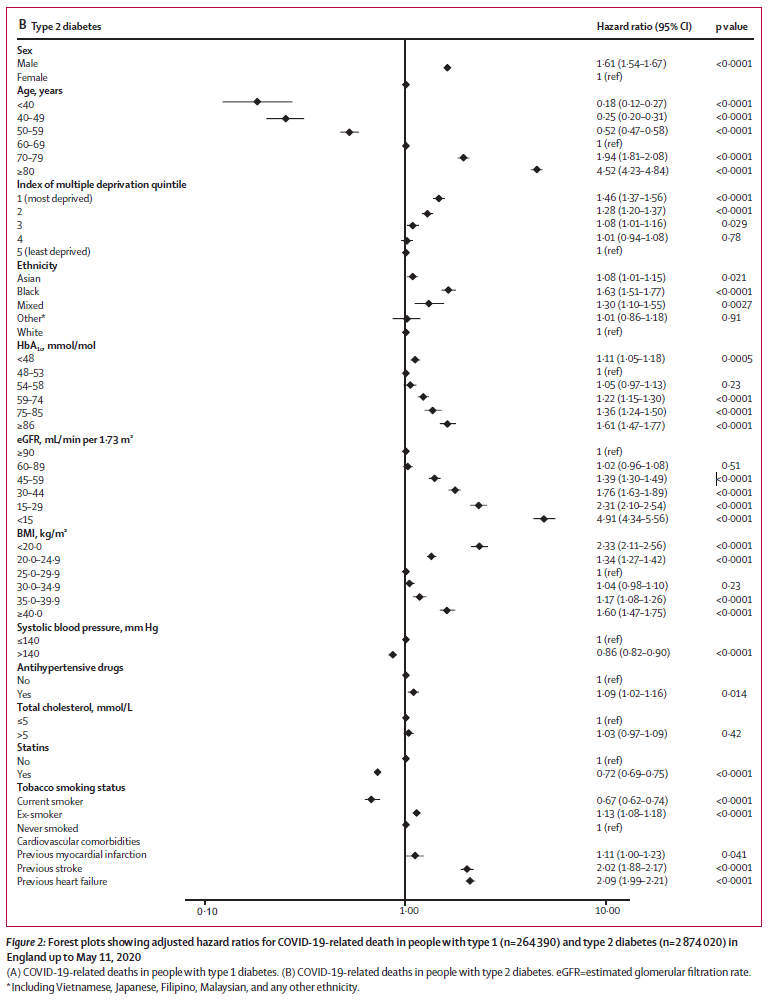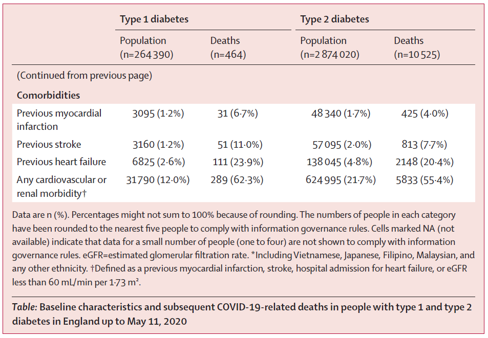 これら全死亡の内、1型糖尿病患者464人と2型糖尿病患者10,525人は、COVID-19関連死であり、1型糖尿病患者289人(62.3%)と2型糖尿病患者5,833人(55.4%)は、「心血管疾患の既往歴、または腎障害(eGFR<60mL/min/1.73m2)」を有していた。