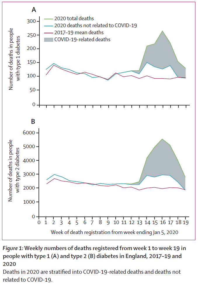 2020年の1月5日迄の週から19週間における毎週の死亡登録数は、2017〜2019年の対応する3年間の週平均を1型糖尿病患者では672人(50.9%)、2型糖尿病患者では16,071人(64.3%)増加していた。